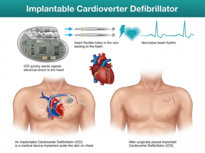 A device implanted to monitor and correct life-threatening arrhythmias by delivering controlled shocks when needed.